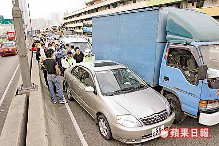 【本報訊】一塊遺留在觀塘繞道的爛木板引發一宗四車相撞意外,車禍中共有兩男兩女受傷,其中一輛肇事客貨車當時正接載一對穿上婚紗禮服的準新人前往拍攝婚紗照,意外中準新人有驚無險並無受傷,兩人事後更站在損毀汽車前拍照留念。 昨午約四時,一輛貨車沿觀塘繞道中線東行至九龍麵粉廠對開處時,司機赫見一塊四呎長、六呎闊爛木板跌在中線,立刻切入快線閃避,卻與尾隨兩輛私家車及一輛客貨車相撞。意外中兩輛私家車上共兩男一女受傷,客貨車上亦有一名女乘客輕傷,救護員稍後將四人送院,警員事後取走爛木板清理路面。