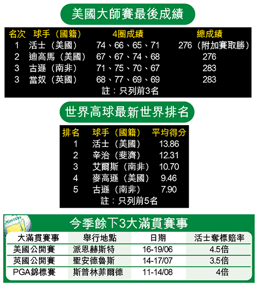 態沉近三年的「老虎仔」活士終於再顯虎威,周日在突然死亡的附加賽打出一個「小鳥」下,成功挫敗四輪比賽後與自己均勢的迪馬高,贏取個人第四面美國高球大師賽冠軍的同時,亦拿下個人第九面大滿貫錦標。賽後激動流淚的活士表示,要將這寶貴的勝利獻給自己患重病的父親。