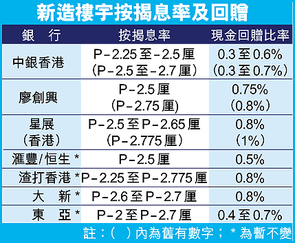 滙豐、恒生及中銀香港等主要銀行,在本月初把新造樓按息率調高0.25至0.275厘,上周一渣打及東亞則帶頭將儲蓄及P,各提高25點子,令P升至5.5厘。目前業內按揭息率約介乎P減2.25至2.7厘。