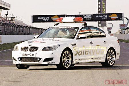為成為最快速四門豪華房車的寶馬M5,去年宣布推出後定單不斷,最近更成為2005年MotoGP的大會安全車。M5用上一台507匹的V10引擎及7前速SMGII波箱,加速媲美超級跑車,絕對有能力帶着大群參賽電單車而行。此外,寶馬的330iTouring及545iTouring,也會成為MotoGP的支援車及500c.c.電單車賽的支援車。