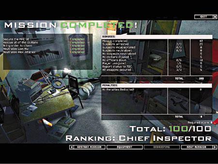 遊戲的一大變數是「即時指令」,Mouse右Click輕按,就可以對手下的紅隊、藍隊下達爆門突入的指令!不過遊戲可是經過SWAT部隊超過25年經驗的隊員KenThatcher微調,事前的情報收集及突入時間的掌握,同現實一樣是出奇制勝的要點;電腦AI超強亦是難玩原因,匪幫每次Random布防,以至反擊、投降都是隨機出現,開槍與否每次都是生死抉擇!大家唔好以為完成所有指定任務就過關,遊戲真實處是使用扣分制,殺人質、隊員受傷、匪徒冇扣索帶都會造成扣分,Normal要求是50分,難度是一般,但要如真SWAT要求的95分,一個失誤已經GameOver,遊戲制度及分級制,都大大增強真實感及耐玩性。