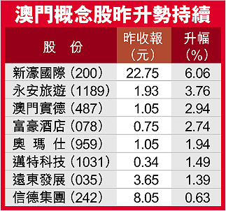 【本報訊】利率趨升為港股帶來不明朗因素,投資者入市態度轉趨審慎,令恒生指數繼續窄幅上落,全日波幅只有62點。大市交投淡靜,造就澳門賭業概念股再度受到追捧(見表)。奧瑪仕(959)昨日成交額超越大藍籌滙豐控股(005);新濠國際(200)升6%創歷史新高,收報22.75元。
