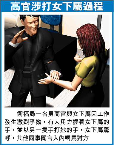 【本報訊】被視為政府中的精英,負責制訂政策的政務主任職系,近日發生罕見男高官涉嫌打女下屬事件。衞生福利及食物局一名月薪逾十二萬元的首席助理秘書長,被指在辦公室內與女下屬爭論工作期間,突然情緒失控,用力捉着該名女助理秘書長的手,用另一隻手打她的手,令女下屬一度驚呼「如果你再唔放開我,我叫非禮」,事後更因身心受影響須休假。公務員事務局已展開調查,肇事男高官遭勒令即時休假及調離衞生福利及食物局。 記者:呂焯均