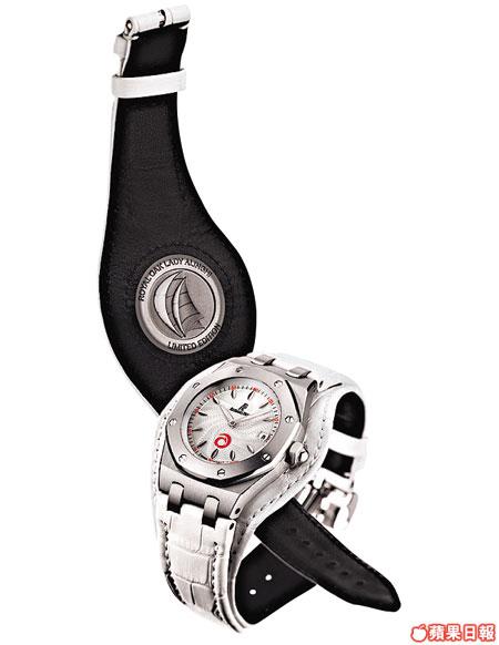 講到AP今年女裝表,個人要選最靚一枚,要算是女裝RoyalOakLadyAlinghi限量版,沒有一顆鑽石,卻一樣閃耀。Alinghi為AP贊助的AmericanCup帆船賽船隊,並於2003年勝出總冠軍,新女裝表以全白色設計,十分夏日,表面飾以"CotedeGeneva"裝飾扭紋,表面一個火紅的Alinghi標記,防水50米。男士見到都話靚,比較可惜係Sporty如此的外表只採用石英機芯。(未定價)