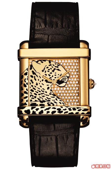 Cartier今年焦點之一,是放了在全新達42mm的PashadeCartier身上,其誠意之處不只是把表殼加大咁簡單,而是請來積家製作全新8000MC機芯;而女裝方面,焦點就一定是一系列豹紋、豹頭的腕表,其中一枚BraceletWatch以18K白金鑄造,外形是一枚豹頭手鐲,豹眼鑲上兩顆綠寶石,而以石英機芯驅動的時間顯示就藏在豹頭下面。野性一點的選擇有下圖一系列琺瑯彩繪表,獵豹靜卧在表面或左或右,相當豔麗。