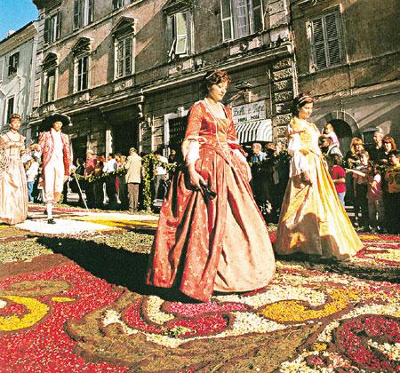 起源於1778年的Infiorata祭,原是祭奉耶穌基督聖體的節慶,意大利各地都有舉行,現只剩下羅馬附近的小鎮GenzanodiRoma仍保留最傳統的慶祝方式。每年6月,來自小鎮的賣花紮花人都聚集在一條長長石級上,日夜地鋪呀砌呀填呀,到了儀式開始前一刻,終於大功告成了!一條用上35萬朵鮮花畫成的2,000平方米的花之走廊展現眼前!儀式進行,樂聲響起,一班穿上中世紀服飾的淑女紳士,隨着手持聖體、向民眾祝福的神父,一步一步的走在花路上……
