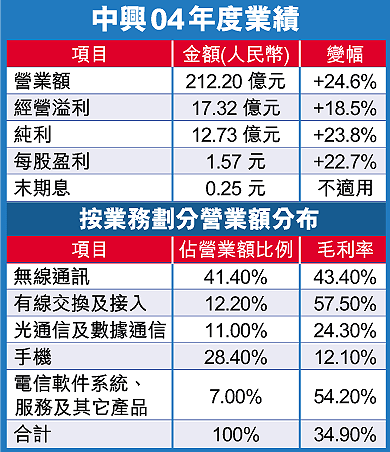 【本報訊】中興通訊(763)公布上市後首份業績,截至04年底止全年純利12.73億元(人民幣.下同),增長23.8%;每股盈利1.57元,末期息0.25元。03年度純利10.28億元。中興昨日收24.3元,跌5.81%。