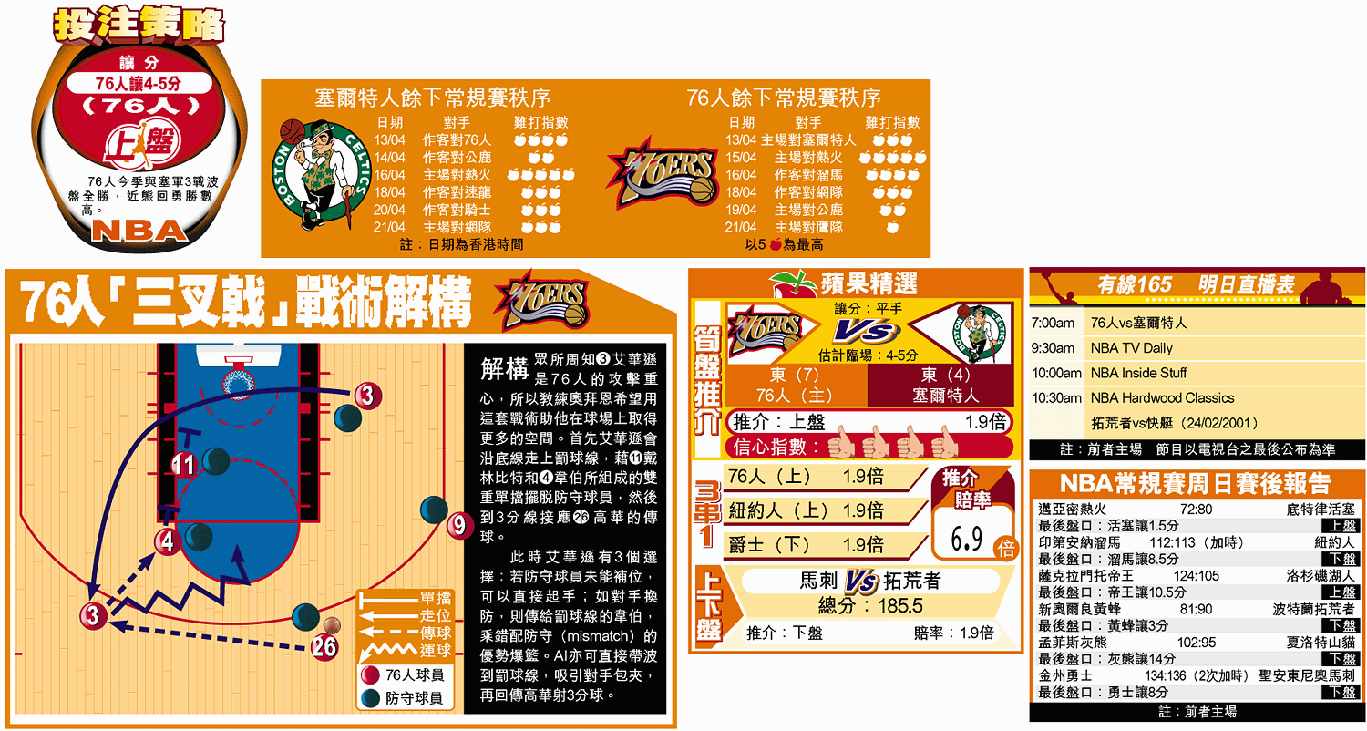 費城76人及波士頓塞爾特人將於周二上演一仗,對爭奪大西洋分區冠軍意義重大的惡鬥。預料視帶傷上陣作等閒的艾華遜,會於此關鍵一戰復出,令得主場之利的76人形勢更佳;加上主隊由前塞軍教練奧拜恩掌帥,知己知彼下更為有利。今番76人少讓四至五分勝數高,上盤穩陣。(有線165台明日7:00am直播)小凡