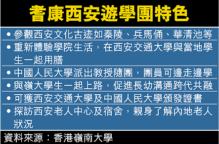 嶺大公共事務處助理公共事務主任劉智仁昨表示,嶺大與耆康會為退休人士提供有益身心的活動,合作推出全港首個「耆趣遊學,邊走邊學」長者遊學西安團,行程五日四夜,團費四千九百九十元。