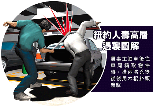 【本報訊】紐約人壽環球保險公司(NewYorkLifeInsuranceWorldwideLimited)副總裁胡建榮,昨晨駕駛其平治房車返回銅鑼灣皇室大廈上班時,在停車場遭兩名懷疑早有預謀的黑衣兇徒,從後用木棍扑穿頭,當場受傷暈倒,送院搶救後無性命危險。傷者沒有財物損失,事後聲稱沒有結怨或欠債。此為繼美國友邦保險公司(AIA)深圳分公司總經理鄭國成被槍擊後,兩個月內第二宗涉及保險公司高層的血案,警方正通緝兩名黑衣漢,並循傷者生活背景及生意網絡等方向展開調查。 記者:胡恩宏、簡明恩