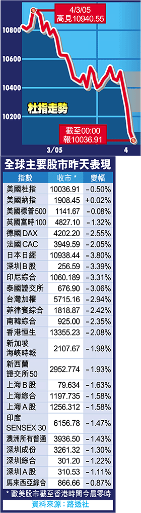 上周五,杜指大跌191.24(1.86%),收報10087.51;納指滑落38.56(1.98%),收報1908.15。在周三至周五的短短3日,杜指累計下挫420.46(4.00%),每日的跌幅均過百點,是逾兩年來首見。