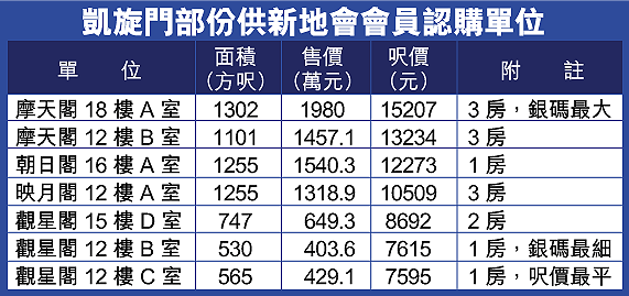 新地代理副總經理陳秀賢表示,凱旋門累售約850伙,平均呎價1.4萬至1.5萬元,套現約100億元。今次供新地會會員認購的單位,全屬海景1至3房單位,總值8.5億元。她直言該盤造價及銷售反應較預期佳,平均價較預期高5至10%。由於新地採惜售策略,本周末開售該批單位後料會封盤。