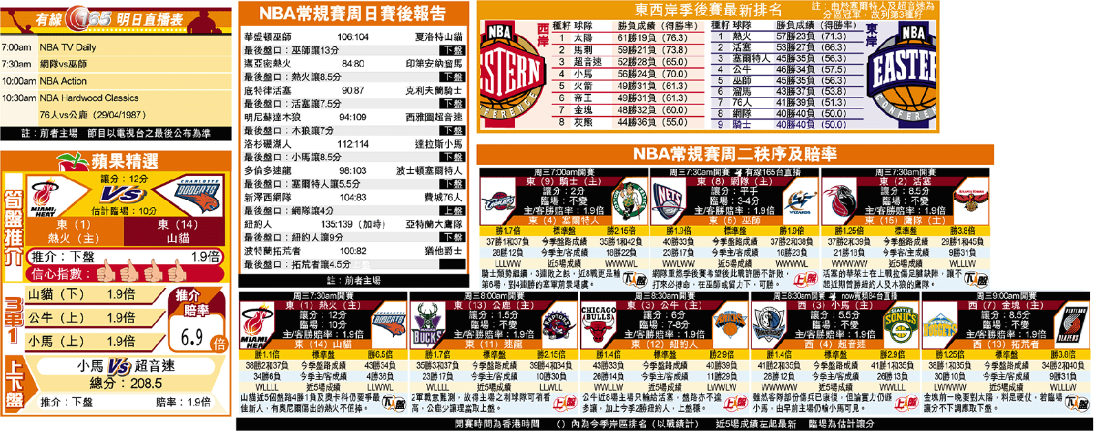 由於同日愈打愈沉的騎士以八十七比九十作客見負活塞,終被近十七戰贏第十三場的網隊追至上,並以較佳對賽成績暫列第八(見附表);目前他們只落後76人一場。角逐東岸剩餘兩個季後賽席位的三支球隊仍餘兩場秩序;76人若能取得一勝、或網隊騎士戰敗,76人即可躋身季後賽;網隊在常規賽分別對76人及騎士均取得較佳勝績。