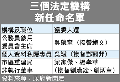 【本報訊】署理特首曾蔭權上場後迅速處理人事任命工作,港府昨日公布三個法定機構新人事任命,分別委任前運輸局局長吳榮奎接掌屬首長第八級的公務員敍用委員會主席,律師會前會長吳斌任個人資料私隱專員及兩名立法會議員梁家傑及楊孝華接任市區重建局非執行董事。