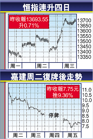嘉華系配股後股價軟,其他澳門賭股未受牽連;新濠國際(200)收19.75元,升3.13%;信德集團(242)收7.8元,漲4.7%;信德更因為去年盈利勝預期而被外資證券行唱好。