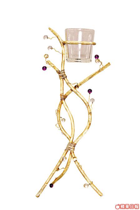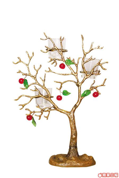 高42cm的銅製燭台,焊接成枯樹形狀,加上塑膠的綠葉及紅色的果實,別有一番特色。樹形擺設上有3個玻璃杯,可以放置蠟燭,美觀實用。
