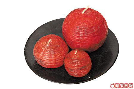 選用橘紅色十分特別,球形蠟燭的外表有着整齊的藤紋,就像是三個大小不一的藤球擺放在木製的圓碟上。