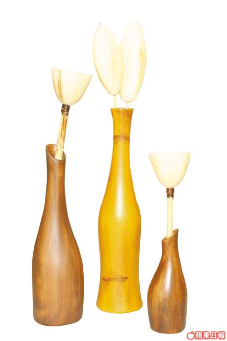 陶土燒成的小樽,配上形狀奇特的蠟燭花,小巧玲瓏卻為家居生色不少。最大的有24cm高,黃色的陶土樽配2支狗尾巴草形蠟燭;中小兩款分別高20cm和12cm,配像蓮藕般的白色蠟燭花。