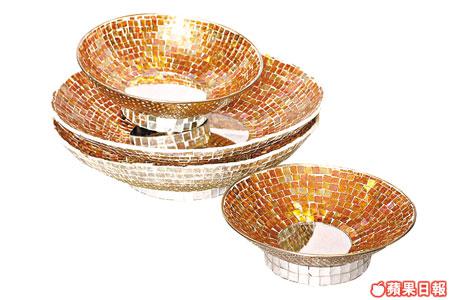 呢款一式四件的生果盤,在盤胚上以人手黏上磨光後的正方形貝殼,在燈光下閃閃發亮,具觀賞價值又可以盛載生果。大盤直徑37cm、細盤直徑23cm,可以因應不同需要而選擇使用。
