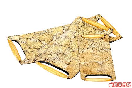 設計特別的長形碟,木製的把手加上以蛋殼壓製而成的碟面,帶有一種原始風味。用來盛載食物,款待客人大方得體。