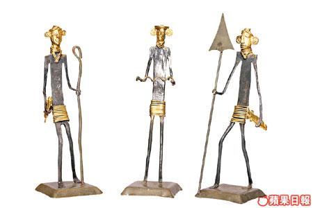 以銅片及銅線焊接而成的人形擺設,三個公仔均有25cm高,塑造成三個從事不同活動的人,有的捕魚、有的放牧。修長的身體,造型特別。
