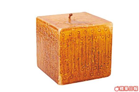 8×8cm的正方體蠟燭,造型簡約,泥黃色的蠟燭四面刻着由線、小圈組成的圖案。除了是蠟燭外,也是精美的枱頭擺設。