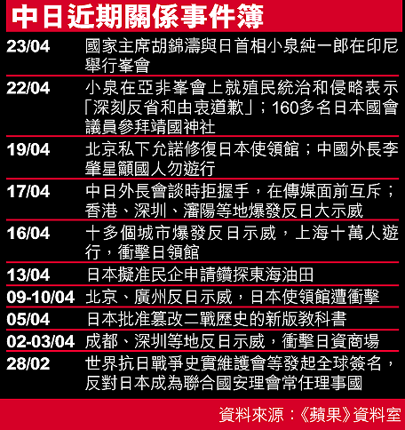 在中日關係急劇惡化、中國連續三個周末爆發大規模反日遊行之後,中國國家主席胡錦濤與日本首相小泉純一郎昨日在印尼舉行了五十五分鐘的會談,重申發展中日關係的重要性。小泉用英文形容會談氣氛「VeryGood!(很好)」雙方同意不再爭議歷史問題和參拜靖國神社問題;胡錦濤則繼續敦促日本不要再做傷害中國人民和亞洲人民感情的事。看來,持續近一個月的中日紛爭,暫告一段落。 中國組