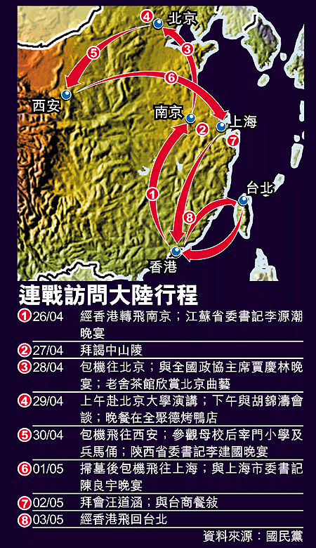 台灣總統陳水扁忽然祝福下,國民黨主席連戰今天展開對大陸的八日歷史性訪問,周五並將和中共總書記胡錦濤在北京會晤,成為國共兩黨六十年來首次歷史性峯會。不過,連戰在啟程前夕突然轉趨低調,昨日在記者會上五度強調他是以個人身份出訪,代表的是國民黨而非台灣政府,「我不是去談判的,大家一定要搞清楚,我也沒有授權代表任何立場」。