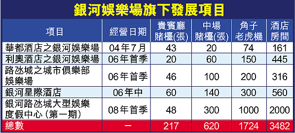 消息人士稱,博彩業運作模式分3種,包括中場、自營貴賓廳及外判貴賓廳,就經營成熟的娛樂場而言,邊際利潤分別為40%、20%及10%。他又稱,銀河將申請中介人牌照,未來經營收入35%將來自中場;65%來自貴賓廳,而貴賓廳中70%外判;30%自營,屆時銀河整體邊際利潤可望提升。