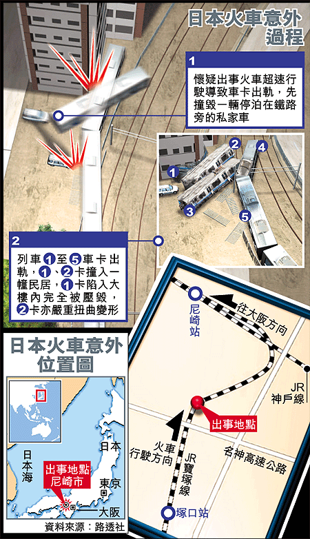 日本昨日早上發生四十二年以來最嚴重的火車出軌意外。在早上繁忙上班時間,日本關西最大縣份、神戶牛柳之鄉兵庫縣一列有七節車卡、載有約五百八十人的火車,在許多中國人旅居和上班的尼崎市,發生車卡出軌撞向民居意外,最少五十七人死亡,超過四百四十人受傷,其中司機重傷,暫未有中國公民傷亡報告。