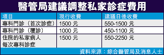 據悉,醫管局一直認為有關收費不具彈性,所以建議調整,住院的私家病人每次專科診症收費調整至五百五十至二千二百五十元;專科門診首次診症由五百五十元至一千五百元,覆診每次四百五十至一千一百元(見表)。