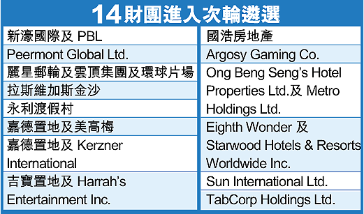 【本報訊】新加坡政府開放賭權,邀請世界各地財團競投兩個賭牌,結果有19個財團參與,經過篩選後,昨日公布選出14個財團進入第二輪競逐(見表),其中3家為香港上市公司有份組成的財團。