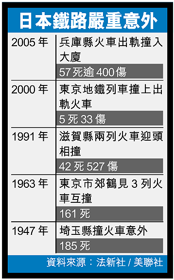 上個月初,高知縣就有火車司機疏忽駕駛,將火車撞穿牆壁衝入車站,司機當場喪生,十多人受傷,列車還嚴重漏油,情況一度危急。○一年福井縣的意外更離譜,兩列對行火車竟在同一路軌上行駛,最後迎頭相撞,數十人受傷。