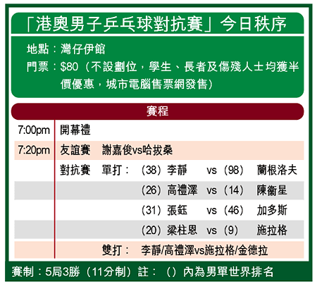 至於五場單打賽,港隊派出將在世界賽負責單打的球手出場,先是香港土生土長的謝嘉俊對奧地利年輕的哈拔桑打頭陣,隨後是李靜、高禮澤、張鈺及梁柱恩。現世界排名二十的「阿柱」將負責最後一單,對世界第九兼世界冠軍的施拉格;看港將們能否藉主場之利擊敗奧地利。賽事採五局三勝十一分制,現仍有小量門券公開發售。