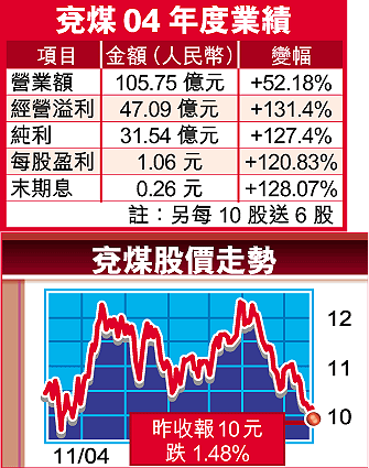 【本報訊】兗州煤業(1171)昨日宣布04年度純利大增1.28倍,至31.54億元(人民幣.下同),末期息增幅除與純利同步外,更建議10送6紅股。兗煤在業績報告中預計,今年煤炭銷售平均價格,仍將較去年大幅增長,因為已簽訂的內銷煤炭合同平均價,已較去年高出32.7%,該公司將採取措施控制成本,令業績持續增長,完成全年3800萬噸的銷售目標。