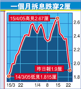 對於資金流入是否令銀行需要掉頭減低儲蓄及最優惠利率,滙豐銀行執行董事柯清輝表示,若隔夜息持續下跌,是會存在一定壓力。永隆銀行業務拓展部主管潘德球則認為,業界未必在5月初美國議息期間掉頭減息,估計維持不變的機會較大。