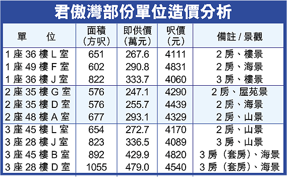 新世界發展營業及市務總監何伍燕榆表示,君傲灣採「圈貨」方式,推出40層單位供代理配售,主要分布1至3座的20至40樓,呎價3800至5600元;她估計已配售的400伙中,用家佔60至70%、投資客佔30至40%。