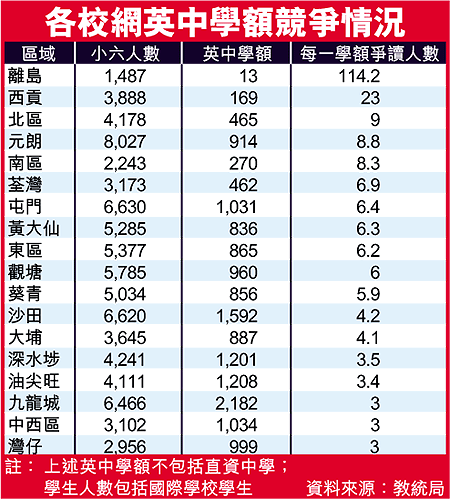 離島區及西貢區的英中學額一直偏少,但遷入的人口卻持續增加,今年兩區學生要入讀英中比去年困難。其中離島區每一英中學額的爭讀人數,由去年的一百人增至今年的一百一十四人;西貢區每一英中學額爭讀人數,也由去年近二十人,增至今年的二十三人。