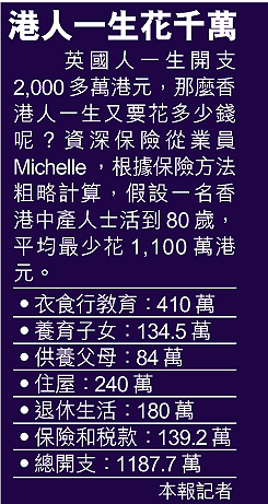人生營營役役:小時候有父母照顧;長大後要自食其力;老來又要為子女憂心,籌謀晚年生活。究竟活一生要花多少錢呢?答案當然因人而定,但據英國保誠保險公司計算,每名英國人一生的平均總開支大約是一百五十萬英鎊,相當於二千二百萬港元。