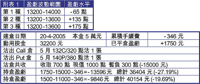 1.改看大市可回升上14000點,在有限資金的情況下,不妨選擇沽出1張5月140P(380點),換去5月的124P(15點),與之前沽出的132C造成一套價內勒束式短倉。獲利點在13300至13800點,按金31800元。若大市再升破13900點才再作補救。