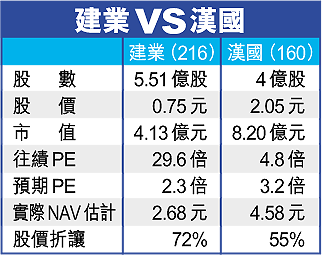 建業每股帳面NAV1.75元,按照漢國資產增值計算,加上本身物業(3.87億元)升值,建業每股實際NAV估計達2.68元,股價折讓高達72%。