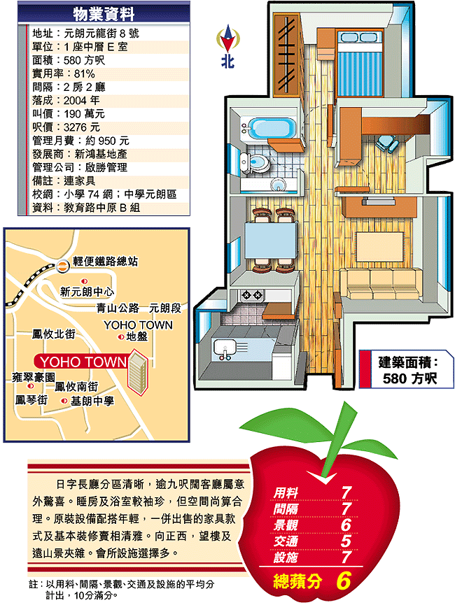元朗YOHOTown形象年輕化,加上偏離煩亂的市中心,在元朗區內,可謂別具一格。兩房細碼供應多,間隔大致分為一字方廳及日字長廳兩類,前者客飯廳無明顯分野,內櫳也最細,由520餘至540餘方呎,後者兩邊廳,間隔清晰,全屋580方呎,連露台的近600方呎,有不同的捧場客。