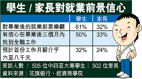 花旗銀行與經濟商學院在今年三至四月訪問了五百零五位學生和五百零二位家長,了解他們對就業前景的信心及理財觀念。調查顯示,逾六成受訪學生對就業前景樂觀,但只得三成二家長有同樣看法。家長最希望子女投身銀行、金融業;青少年則最希望從事旅遊、酒店工作。