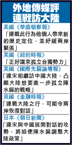 國際主流傳媒昨日均有報道連戰訪問大陸。美國《華盛頓郵報》、《紐約時報》指,連戰此行可望為他個人帶來新的歷史定位,並且紓緩兩岸在大陸通過反分裂法後的緊張氣氛。而日本《朝日新聞》認為,台灣總統陳水扁將承受更大壓力,被迫調整對大陸的政策。