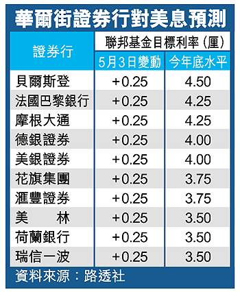 根據路透社上周五的調查,20家受訪美債莊家交易商一致認為,聯邦公開市場委員會(FOMC)將於5月3日,把現處2.75厘的聯邦基金目標利率,調高0.25厘;19家券商更預期,當局在6月29至30日會議後再加息0.25厘,只有瑞士信貸第一波士頓相信FOMC下月將暫緩收緊銀根(見表)。