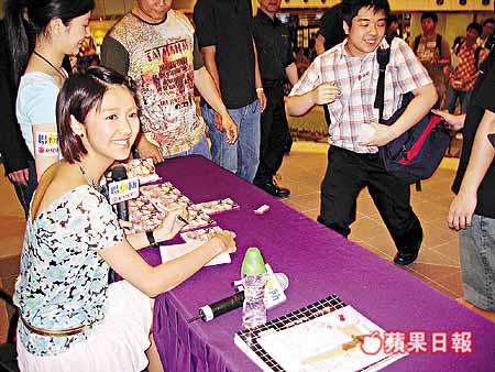 薛凱琪(Fiona)昨日到荃灣為新碟舉行簽唱會,吸引了近百位歌迷到場支持及索簽名,Fiona收了不少禮物。現場有一位癡情男歌迷(圖一右)突然向她下跪,並說:「草民叩見Fiona娘娘!」令Fiona十分尷尬,但她大讚對方很有創意。