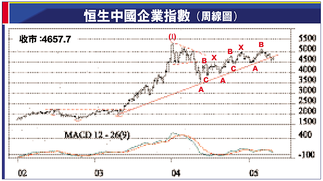 內地宏調加強中,國企指數長期升軌4780前周失守(見圖),最低4550,上周後抽,最高4674,又掉頭下跌,上周五收4657.7,跌41點,比3月收市4793,跌136點。國指02年最低1745,形成頭肩底後,03年大幅狂升,04年1月高見5440,日線圖形成黃昏之星,A浪5月跌至3501,B浪強力反彈,至今年3月最高5054,由於下破升軌,(Ⅱ)浪或下試3500。