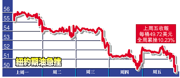 由於石油輸出國組織料將增產,加上美國原油庫存增加,及美國上季經濟增長放緩,令紐約原油6月期貨上周五曾下瀉2.67美元(5.16%),低見每桶49.10美元;最後跌2.05美元(3.96%),報49.72美元,為2月18日以來首次收低於50美元。