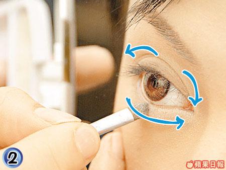 2.在上眼線眼頭向後及眼尾向前各三分一位置,掃上墨綠色眼影;下眼線亦從眼尾向前約三分二掃上眼影。