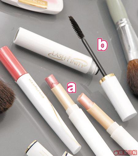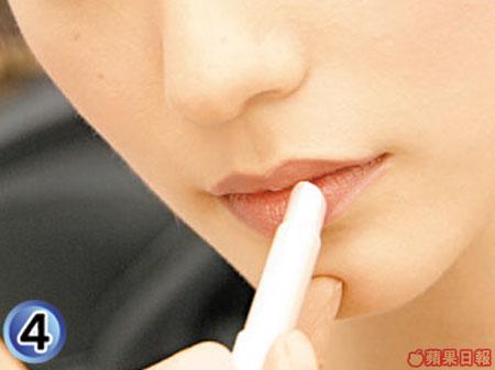 4.塗上睫毛液,要由睫毛根部向上拉,在中央部份多塗一點,營造DollyEye。塗上朱古力色唇膏液,再塗同系潤唇膏。